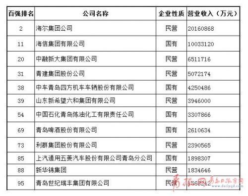记者从2017山东企业100强发布会上了解到,今年青岛共12家企业上榜,数量位居全省第三,其中有5家国有企业,7家民营企业,分别为海尔集团公司、海信集团有限公司、中融新大集团有限公司、青建集团股份公司、中车青岛四方机车车辆股份有限公司、山东新希望六和集团有限公司、中国石化青岛炼油化工有限责任公司、青岛啤酒股份有限公司、利群集团股份有限公司、上汽通用五菱汽车股份有限公司青岛分公司、新华锦集团、青岛世纪瑞丰集团有限公司。