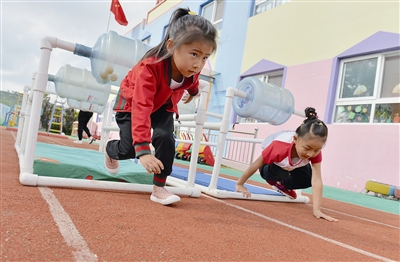 ■崂山区北宅街道洪园幼儿园的小朋友在做户外活动。周光辉 摄