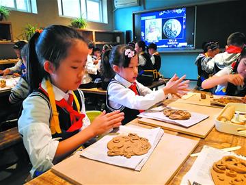 市南区实验小学的孩子们进行海洋生物陶艺制作。