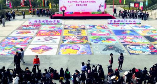 10月20日上午,青岛六中第二十五届艺术节开幕,当天的重磅就是24个班级近千名学生共同在新校的大地上作画,组成24个主题的宏伟画作。学生们以“梦想”为主题,画作创意十足震撼全场。据了解,今年是青岛六中第25次让学生们亲手创作大地彩绘。