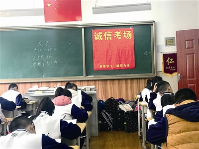 ■我市各中小学陆续迎来期中考试。日前,青岛34中的两个考场迎来了一场特殊的考试——没有监考老师,只有黑板上书写的四个大字“诚信考场”。为培养学生的诚信意识,青岛34中已连续三年设立诚信考场。“诚信是立人之本,先成人,后成才。为使诚信教育浸润校园,学校设置诚信作业,文明礼仪达标等环节,每日开展的国学诵读十分钟,也蕴含诚信内容。”校长马鹏业告诉记者。