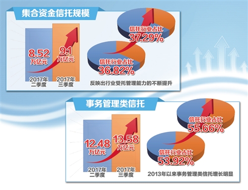 “2017年三季度行业数据充分反映出近年来信托业在监管机构引导下的转型发展成效,尤其是在资产管理、财富管理、受托服务等方面的创新探索更加深入,专业能力不断提升,为新时代信托业的发展提供了重要保障。”中国信托业协会特约研究员和晋予表示。