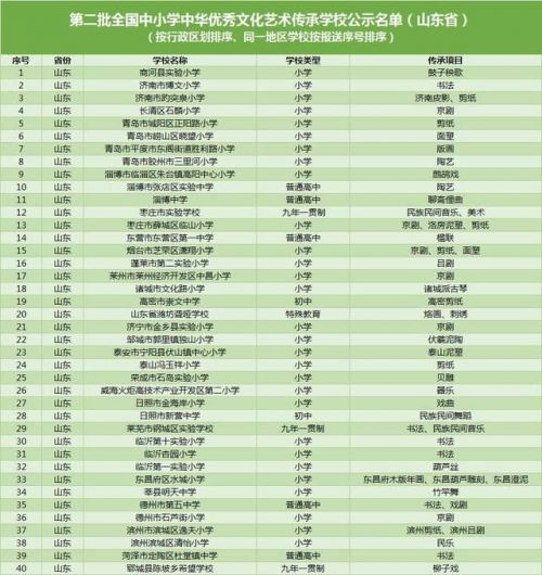 其中,山东省共有40所中小学榜上有名,其中青岛4所学校上榜,名单里都有山东省哪40所学校?我省又有哪些学校已经被认定为第一批全国中小学中华优秀文化艺术传承学校了呢?我们一起来看↓↓↓