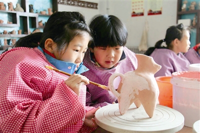 依托地域优势,挖掘本土资源,三里河小学在2010年9月专门组建了陶艺文化传承课题研究小组,追根溯源,探究陶艺文化发展历史。2012年,该校根据不同学龄段学生的接受能力,组织教师编写了上中下三卷《小陶器》系列校本教材,一、二年级以彩陶为主,三到六年级以泥陶为主,让全校2000多名学生都能充分接触泥巴,感受陶艺魅力。