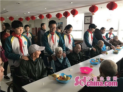 中国山东网青岛2月5日讯 (记者 姜婷 通讯员 王文涛) 2018年2月4日,是二十四节气的第一个节气立春,距离18年小年仅有三天,虽然今天天气非常寒冷,但是也挡不住温暖的爱心,崂山区育才中学2016级七班的学生和家长冒着严寒来到了崂山区社会福利服务中心二楼失能失智专区来了一场爱的奉献。