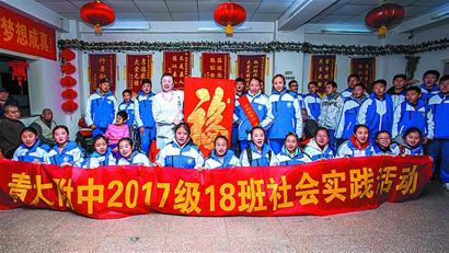 晚报讯 2月5日,来自青岛大学附属中学初一18班40名同学参加了青岛晚报记者进社区活动,他们走进青岛福寿星爱心护理院,帮老人剪指甲、洗头、梳头,并把精心书写绘制的“福”、“寿”、国画牡丹等送给老人们,还表演了独舞、古筝、小提琴、吉他独奏慰问老人。得知青岛晚报记者进社区活动爱心团队走进青岛福寿星爱心护理院,中国著名书法家、青岛市榜书艺术研究会主席云发海书写了榜书“福”,委托本报工作人员赠送给护理院。