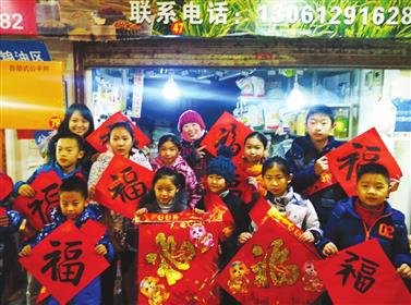 孩子们为临街商铺送上亲手书写的“福”字。