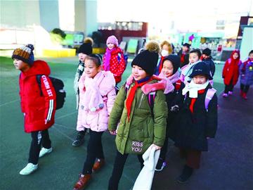 ■市北区实验小学的孩子们开开心心地进校园。 吴希 摄
