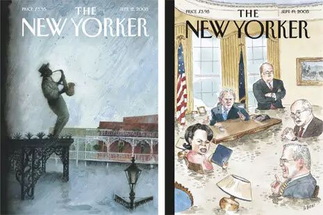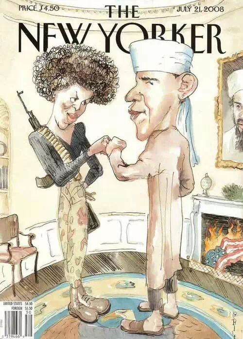 2008年7月21日:奥巴马与恐怖分子。在奥巴马竞选总统过程中和当选之后,有一些对他特别荒谬的人身攻击,有人说他和妻子是穆斯林极端分子,还有更可笑的,一些政治人物在福克斯的右翼电视台上公然说,奥巴马跟人握手的方式是恐怖分子见面时的两个人击拳方式。于是这期就把人们马上会想到的典型的恐怖分子形象的元素,全部用在了奥巴马夫妇身上以引发全民参与讨论。
