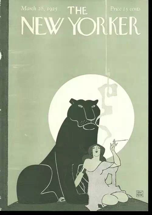 1925年2月21日:创刊号。英国摄政时代打扮的绅士尤斯塔斯·提利 Eustace Tilley,戴着单片眼镜观察蝴蝶。 以后的每个纪念刊,都会以他的形像按照原来的姿势重画封面。