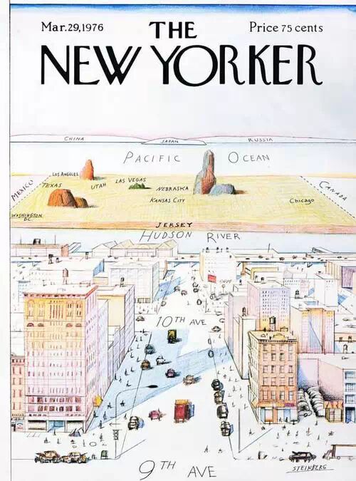 1976 年3月29日:纽约鸟瞰。用彩色蜡笔画的纽约城。画面从第九大道的空中往西看,一路可以看到哈得逊河、新泽西等,然后是太平洋和中俄日。这个封面被无数次的复制和模仿,每个城市都想要一个自己的版本。甚至在多年以后,《纽约客》自己也模仿了一张。