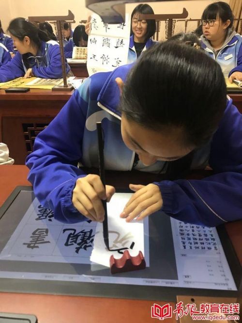 纵横捭阖辟新径,作为岛城唯一一所开设书法班的局属高中,16中不仅在软件上配备优质师资;硬件上,更是斥资八十多万,打造数字化书法教室。教室每张桌上都配有触屏平板电脑,每台平板电脑里都有海量书法素材,学生可以自行选择素材,把纸铺在电脑屏幕上练习临摹。讲课时,老师可以选择任意学生的作业投射到教室电子屏上圈点讲解。相比传统方式的教学模式,字体放大临摹,可以让学生更精准地把握字的结构和用笔;投影讲解,实时解析学生作品问题,提高了课堂效率;海量素材的储备也提高了学生的学习积极性,让学生变得更加主动学习。