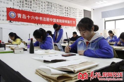 为培育书法精英人才,软件方面,16中为书法班不仅配备了学校骨干教师,还聘请了实力强劲的外援团。引进来,与曲师大联合办学,外聘曲阜师范大学等高校书法专业教师定期到校进行专业指导培训;建立“名师工作室”,聘请青岛市书法家协会、青年书法家协会的书法名家到校开展“书法名师讲堂”活动。走出去,组织学生去中国美院、曲阜师范大学等书法名校研学,让学生直接面对面接受书法大家指导。这个清明节,16中就联合青报教育在线组织高二书法班学生南下杭州研学,去中国美院聆听书法名师韩天雍教授讲座和研究生导师钱伟强教授的古文讲座,到石雨斋艺术学校学习书法临摹和篆刻。