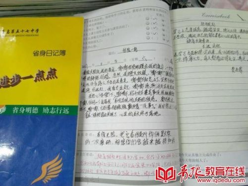 据了解,学生还坚持写省身日记,57中形象地称之为“省身道德长跑”,引导学生记录自身学习、生活、心路历程,反思得失。家长、教师也参与其中进行引导、鼓励和评价,形成学生、家长、教师三位一体的“省身教育三部曲”。省身日记不仅是一种学习习惯的培养,也是学生自我教育的重要方式,更成为学生学习的发动机,意志的磨刀石。