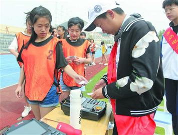 记者注意到,崂山二中考点新上了一套测考设备,该设备覆盖了测试的所有项目,比如排球垫球,男生须垫到2.24米、女生须垫到2米以上才算合格,以往都是在上方拉张相应高度的网,通过人工数触网数来判定成绩。而新设备使用红外线感应,考生进入测试区,每次垫球合不合格,上方的框状感应圈自有公断。再比如仰卧起坐,考生仰时上背必须触到感应垫,卧时上身必须触及架在双腿上方的红外线,才算合格,较人工评判,仪器测考更加公正、客观、准确。比如长跑,考生每人都佩戴手表大小的轻便定位设备,从发令到制止抢跑,再到通过终点线的计时,全部由仪器来完成。