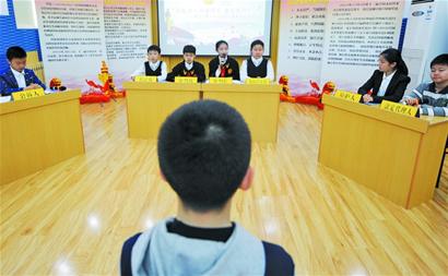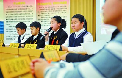 市南区实验小学的学生在“模拟法庭”上“审理”案件。新华社发“模拟法庭”现场。 新华社发
