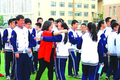 “生涯导师为孩子们的成长点赞,希望以心理活动促使师生的心灵更近,更亲。学校确定全员育人导师制的教育机制之后,学生选择自己信任的老师作为生涯导师,全校教师积极投入其中,关注学生的生活、思想成长和青春困惑,走进学生的家庭,与家长密切沟通,助力孩子们的成长。”青岛四中校长张文革介绍,5月25日是心理健康日,学校将相关活动拉长到一周时间。在心理拓展活动的现场,学生打破了常规的行政班级编制,在拥抱了班主任之后纷纷奔跑向自己的生涯导师,与生涯导师握手拥抱。生涯导师们各自带领自己的辅导团队,跟随学校专业心理教师王新玲的指挥,开展起“心有千千结”“平地而起”等心理拓展游戏。