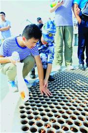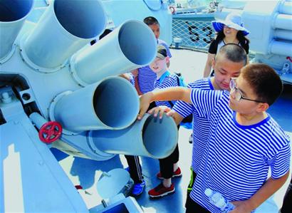 青岛市盲校凭借悠久的办学历史和近百分百的高考升学率,今年吸引了来自北京、上海、广州、天津、太原、沈阳等多地的生源,而对参加军训的中学部盲生而言,昨日赴海军博物馆的参观格外值得期待。 “很多孩子是第一次来到青岛,更是第一次登上军舰,零距离感受飞机、舰船,那种震撼感是他们从未有过的。 ”校团委书记林若飞告诉记者,在参观的过程中,盲生们一次次用“震撼”来形容自己的感受。