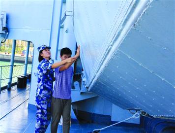 海军某部的教官引领盲生触摸105舰上的导弹发射器。抚摸舰载直升飞机降落坪。