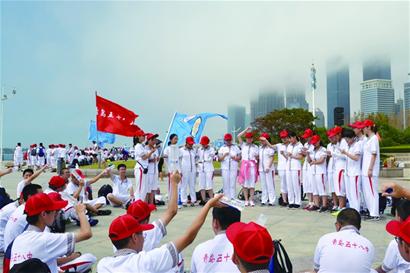 上午7时30分学生们在第一海水浴场集合,捡拾了约半个小时垃圾,随后就沿着海岸线开始了一天的拉练活动。上午不到10点,他们就到了音乐广场,学生们在这里开始了“唱响青春”班级合唱。 “早就听说了学校军训期间会有拉练,也很期待,终于盼到了这一天。从一浴过来走了2个小时,一点没感觉累,倒是沿途的风景很不错,大家心情都很好。 ”高一6班学生黑昀熙说,今年暑假他跟小伙伴骑自行车出去玩,结果半路自行车坏了,他被动体验了一次“长途拉练”。