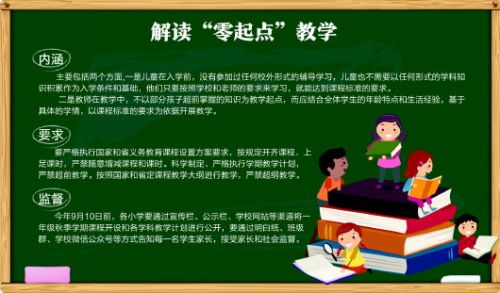 市教科院相关学科专家解读称,“零起点”教学的内涵主要包括两个方面。一是儿童在入学前,没有参加过任何校外形式的辅导学习,儿童也不需要以任何形式的学科知识积累作为入学条件和基础,他们只要按照学校和老师的要求来学习,就能达到课程标准的要求。二是教师在教学中,不以部分孩子超前掌握的知识为教学起点,而应结合全体学生的年龄特点和生活经验,基于具体的学情,以课程标准的要求为依据开展教学。
