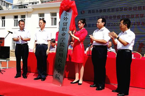照片为出席领导为山东外贸职业学院应用技术学院揭牌。