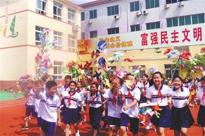 本报讯(记者 王墨然)“大风车吱呀吱哟哟地转,这里的风景呀真好看……”青岛振华路小学新学期在五彩缤纷、充满创意的风车中拉开了序幕。开学典礼上,三名学生代表向大家介绍他们的风车是用废旧材料冰糕棒、包装纸制作的,不仅体现了环保低碳的理念,上面还写了新学期自己要追赶的小目标。更多同学们则在亲手制作的风车上写的寄语是“好好学习、天天向上”“写好每个字,每天进步一点点”,怀着朴素的愿望开启新的学期。