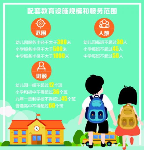 同时强调控制配建学校(幼儿园)规模和班额。所配建的幼儿园一般不超过12个班,小学和初中不得超过36个班,九年一贯制学校不得超过45个班,普通高中不得超过60个班;幼儿园平均每班不超过30人、小学每班不超过45人、中学每班不超过50人。鼓励开展小班化教学,设置小规模学校。