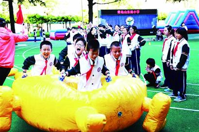 山东路小学的运动会兼顾了“趣味”和“运动”双重特性,整个运动会活泼、激烈、欢乐、有序,让学生们在快乐中运动,在运动中快乐。青岛明德小学的“快乐运动强健体魄,趣味体验传统文化”趣味运动会将体育竞技转换成了竞技加传统游戏,让孩子体验运动的快乐、竞争的乐趣,培养孩子的规则意识及协作精神,激发孩子的运动潜能。孩子们和家长、老师共同参与的毛毛虫竞速、指压板竞赛、无敌风火轮、龟兔赛跑等趣味性游戏让现场气氛热烈,运动场上空飘荡着孩子们开心的笑声。 青岛晚报/掌上青岛/青网 记者 赵黎