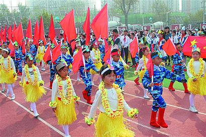 本周,青岛四方小学将体育运动会与学校一年一度的海洋周活动相结合,借助海洋生物大家庭活动,将原来的运动会形式调整为群体性体育形式展示,根据队员年龄特点设计不同的运动项目。开幕式上,各班围绕海洋生物进行设计和展示,在服装、头饰及道具方面精心准备。 “海洋生物”对对碰、“鱼跃龙门”跳远比赛、“海洋家族”接力赛、海洋争霸赛等项目,让运动会“海味儿”十足。 记者 赵黎