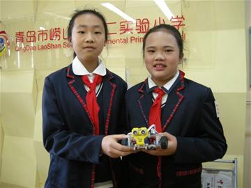 在看到老师分发作业很辛苦后,崂山区第二实验小学的小创客们经过1年多的钻研,自主编程、设计、布线搭建了具有自主知识产权的机器人 “智能课代表”。崂山实验二小还自编了全国第一套机器人创客校本教材。五年级的郝冠霖是个细心的孩子,他发明了 “旋转量角器”和 “可换内容的袖章”,两项发明均在市一级科技创新大赛中获奖。