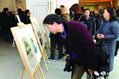人们参观青岛市美术教师和青岛十七中学生作品展。年会上清华美院雕塑系主任董书兵现场做专题报告。