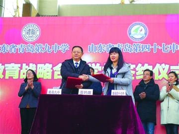 在欢迎辞中,47中校长张静表示,全校师生和家长对此次合作寄予了厚望,通过与青岛9中的教育战略合作交流,能够促进47中的教师队伍建设、教科研教学和学生培养,让有着50多年历史的青岛47中实现新的质的飞跃。在全校师生的见证下,青岛9中校长马志平与张静在合作协议上签字并交换协议书,市教育局基教处处长项骏与市北区教育局局长王本猛共同为战略合作校揭牌。
