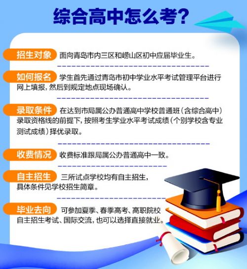 记者从青岛市教育局公布的《青岛市综合高中建设工作实施方案》中看到,从今年起青岛市将推行综合高中办学模式,并逐步扩大综合高中办学规模,试点范围由局属学校扩大到区市。青岛市教育局局长刘鹏照说,综合高中的落地标志着青岛教育进入一个新阶段。根据规定,2019年局属学校在青岛市理工高级中学、青岛艺术学校、青岛商务学校进行试点。招收人数分别为200、200、100人,综合高中试验班班数分别是4、4、2个。同时要求,有高中学校的区市每区市至少有1所学校进行综合高中试点。