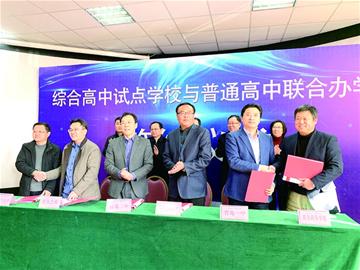 学生入学统一注册普高学籍,根据高一结束相关测试结果,可以重新选择职业教育或者普通教育,将来参加春季高考或夏季高考。昨天,市教育局正式印发了《青岛市综合高中建设工作实施方案》,在加挂“青岛市理工高级中学”牌子的青岛高新职业学校和青岛商务学校、青岛艺术学校启动综合高中试点。从今年起我市将推行综合高中办学模式,并逐步扩大综合高中办学规模,试点范围由局属学校扩大到区市。与此同时,3所学校还分别与青岛2中、青岛1中和青岛17中开展合作办学,将在师资队伍、课程开发等方面全面合作,共同推动综合高中建设。