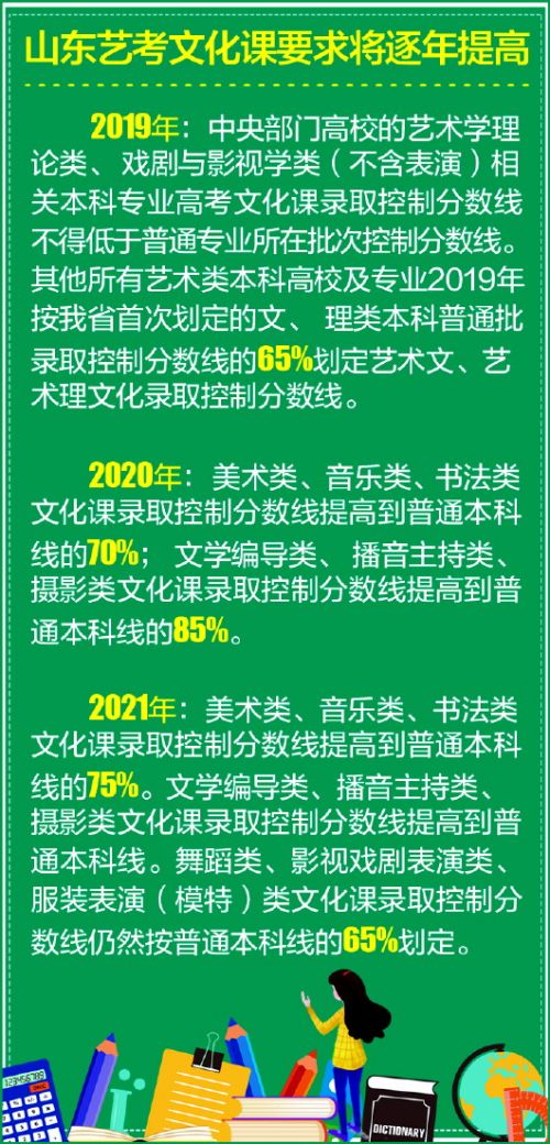 2月21日,山东省招考院下发的艺考新规明确:2020年美术类、音乐类、书法类文化课录取控制分数线提高到普通本科线的70%;文学编导类、播音主持类、摄影类文化课录取控制分数线提高到普通本科线的85%。2021年美术类、音乐类、书法类文化课录取控制分数线提高到普通本科线的75%。文学编导类、播音主持类、摄影类文化课录取控制分数线提高到普通本科线。舞蹈类、影视戏剧表演类、服装表演(模特)类文化课录取控制分数线仍然按普通本科线的65%划定。