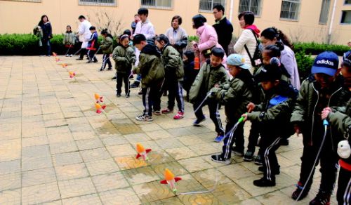小学生们进行水火箭发射比赛。