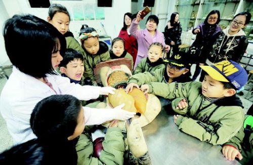 医学院的专职人员通过人体教具模型,为孩子们讲解身体内脏的组成,并通过模型教小朋友如何正确刷牙、吃饭时为什么不能大声说笑、如果吃饭噎到时如何急救等。之后同学们参观了人体标本陈列室,了解了人类的生命起源等。