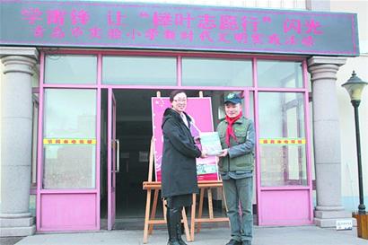 徐立强向梁景萱校长捐赠生态保护图书。2·6中队用各种方式演绎雷锋精神。