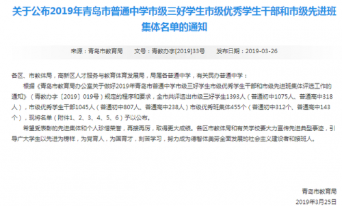 青报教育在线讯iqdedu.com 3月26日,市教育局公布了2019年普通中学市级三好学生、市级优秀学生干部和市级先进班集体评选结果。全市共评选出市级三好学生1393人(普通初中1075人、普通高中318人),市级优秀学生干部1045人(普通初中807人、普通高中238人)市级优秀班集体455个(普通初中312个、普通高中143个)。