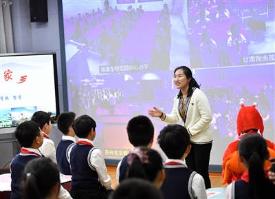■4月11日下午,青岛、日喀则(桑珠孜区)等五地连线课堂在青岛嘉峪关学校开课。此次活动通过互联网成功连线,实现五地学生同步学习交流。 周光辉 摄