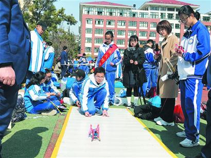 其中科技项目创纪录地设置了34个选项,堪称“海陆空”无所不包。纸船载重、水面竞速等水上项目,现场演绎“凌波微步”,学生们自己设计制作的各样船只,在水面上轻松游弋,让到场的嘉宾和家长代表无不惊叹。四驱车竞赛、车辆打靶、幻影车神等陆上项目,则让参赛选手肾上腺素飙升,在创新和动手实践中感受速度与激情。轻骑士、翼神、飞鲨、奔月等飞机项目,或比拼滞空时长,或角逐方向与速度,用小小的飞机模型,诠释直上云霄的魅力。