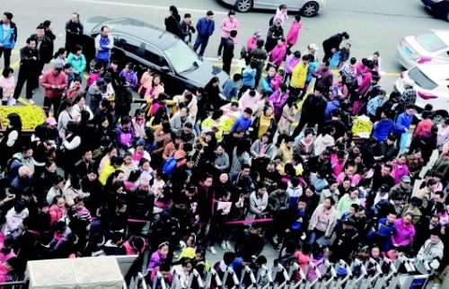 4月13日一大早,青岛弘毅中学校门前报名学生和家长就排起了长队。